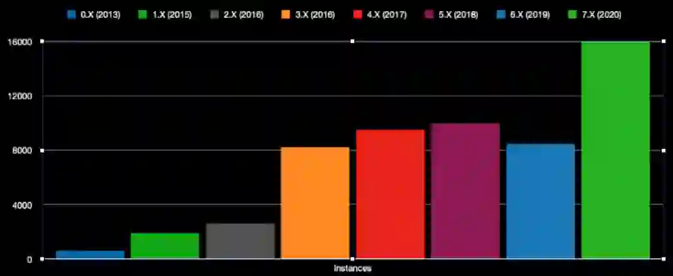 此外,我们发现还有其他大量使用过时版本的项目,甚至还有代码库使用零版本的 ESLint。以下是各个开源项目使用 ESLint 的版本分布详情:
