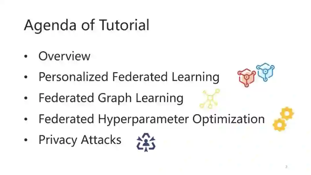 由于互联网用户对自己隐私的重视,以及大多数国家的一些法律法规的实施,互联网产品需要为用户提供隐私保护。联邦学习作为提供这种隐私保护的可行方案之一,近年来在学术界和工业界迅速受到欢迎。在本教程中,我们将从一些现实世界的任务开始,以说明联邦学习的主题,并涵盖一些基本概念和重要的场景,包括跨设备和跨竖井设置。与此同时,我们还将演示几种流行的联邦学习框架。我们还将展示如何使用联邦学习进行自动超参数调优,从而在实践中大大节省工作量。然后我们深入探讨了三个并行的热门话题:个性化联邦学习、联邦图学习和联邦学习中的攻击。对于它们中的每一个,我们将用真实世界的应用来激发它,说明最先进的方法,并使用具体的例子讨论它们的优点和缺点。最后,提出了今后的研究方向。