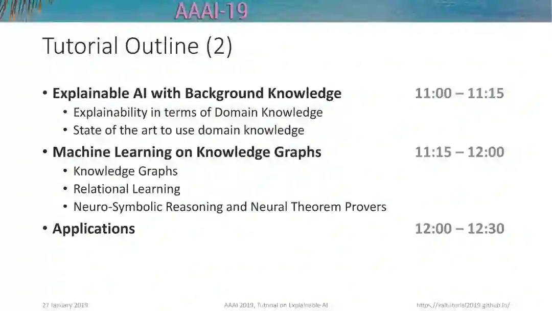 在本教程的第一部分中,我们将介绍AI解释的不同方面。然后我们将本教程的重点放在两个具体的方法上:(i)使用机器学习的可解释AI和(ii)使用基于图(graph)的知识表示和机器学习结合的可解释AI。对于这两者,我们深入探讨了该方法的具体细节,现有技术以及后续步骤的研究挑战。本教程的最后一部分概述了可解释AI的实际应用。