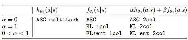 表 1: 实验中评估的 7 个不算法。每一列描述一个不同的架构,每列的标题指示任务策略的 logit。行定义 KL 与 熵正则化损失函数的相关量,第一行包括 A3C 基线(没有 KL 损失函数)。