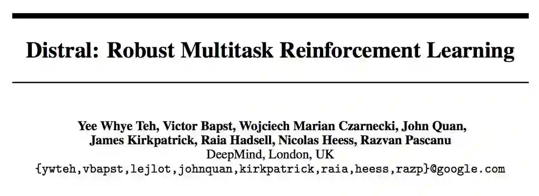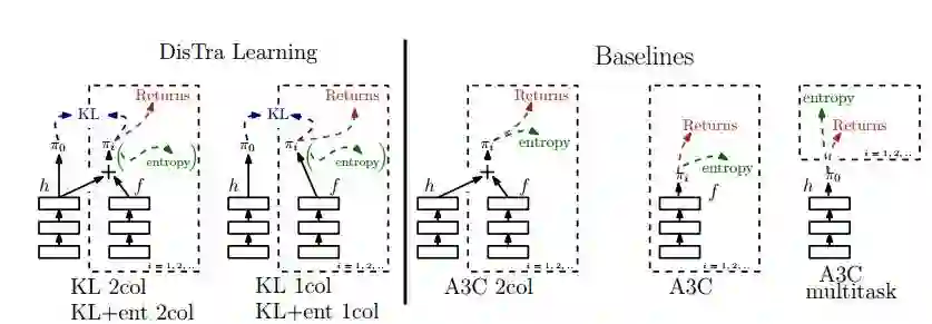 我们提出了 Distral,一种用于提取(distilling)和迁移多任务强化学习中一般行为的通用框架。在实验中,该最终算法不仅能更迅速地学习、产生更好的性能,同时还能更加稳健和鲁棒地设置超参数。我们发现 Distral 能显著地优于为多任务和迁移强化学习共享神经网络参数的标准方法。