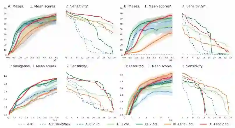 图 4:上图 A1、C1 和 D1 展示了任务具体型(分别为迷宫、导航和 laser-tag 任务)策略性能(所有任务的均值),其中这几幅图 x 轴代表每个任务训练环境步的总数。B1 图展示了由使用提取策略(distilled policies)所获得的均分值。对于每个算法,我们基于曲线下面积展示了最优超参数设定。A1、B1、C1 和 D1 中的粗线为四次运行的均值,而彩色的区域为每个任务的平均标准差。图 A2、B2、C2 和 D2 展示了每个算法 36 次运行的最终性能,并且从好到坏排序(9 个超参数设定,且运行了四次)。