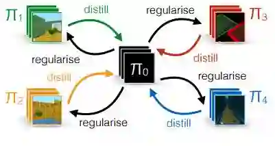 该论文最重要的两个发现:即我们发现使用 KL 散度正则化任务模型的输出为已提取模型(distilled model)时,提取(distillation)可自然地作为优化过程的一半。另一半则相应于使用已提取模型作为任务模型训练的正则器(regularizer)。另一个发现是深度神经网络中的参数通常不具备语义意义,所以我们并不在参数空间内正则化(regularizing)网络,因此我们有必要考虑在更加具备语义信息的空间中正则化神经网络,如在策略空间中正则化神经网络。