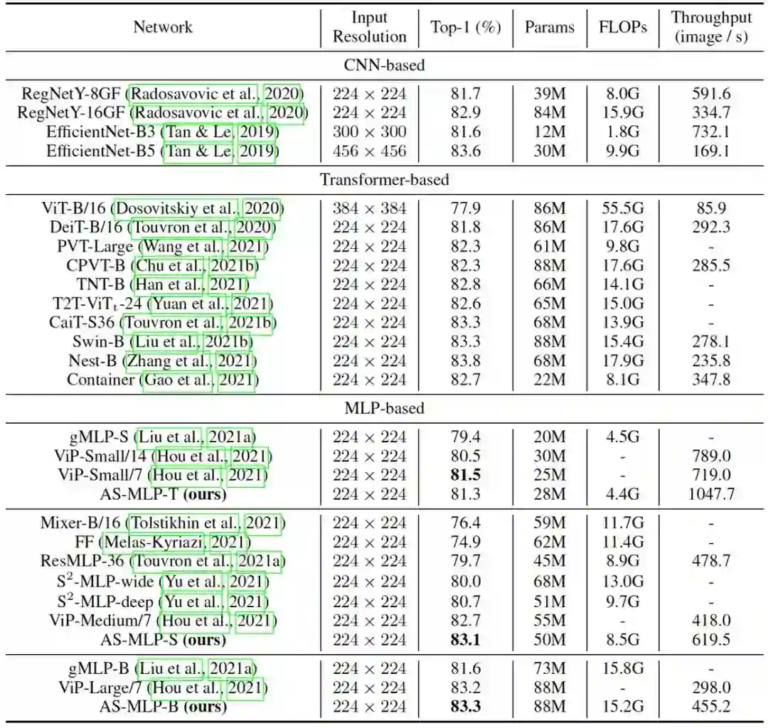 表一显示了所有网络在图像分类任务上的结果。我们将所有网络架构分为基于 CNN、基于 Transformer 和基于 MLP 的架构。输入分辨率为 224 x 224。当保持相似的参数量和计算量时,我们提出的 AS-MLP 优于其他基于 MLP 的架构。例如,AS-MLP-S 获得了83.1%的准确度,这优于 Mixer-B/16 (76.4%) 和 ViP-Medium/7 (82.7\%)。此外,与基于Transformer的网络框架相比,它获得了具有竞争力的性能。例如 AS-MLP-B 获得了83.3%的准确度,这与Swin-B的性能相当,显示了我们的 AS-MLP 框架的有效性。