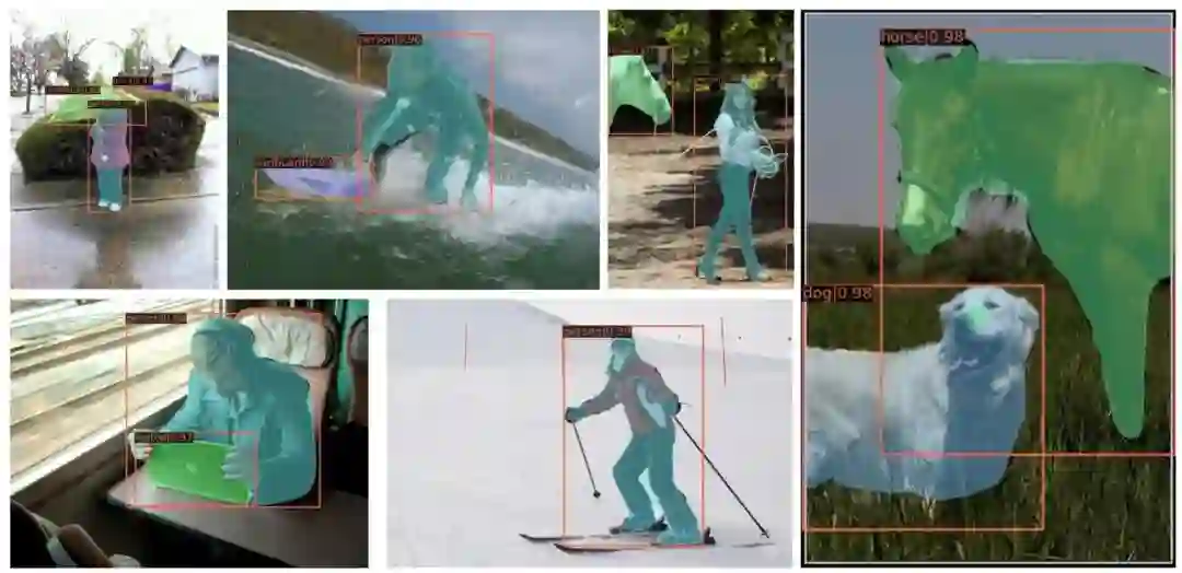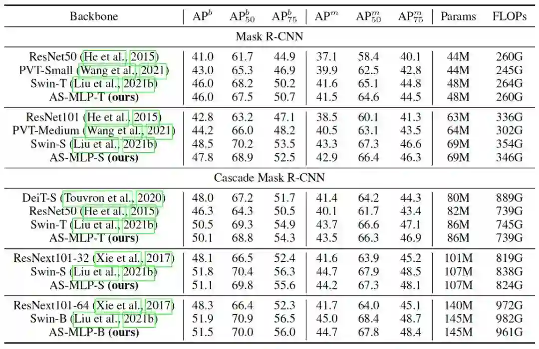 目标检测和实例分割的结果见表二,值得注意的是,我们没有将我们的方法与 MLP-Mixer 进行比较,因为它使用固定的空间维度进行 MLP操作,目标检测的输入尺寸不是固定的,因此不能迁移到目标检测中。据我们所知,我们是第一个将基于 MLP 的架构应用于目标检测的工作。我们的 AS-MLP 在类似的资源限制下实现了与 Swin Transformer 相当的性能。具体来说,Cascade Mask R-CNN + Swin-B在145M参数下达到51.9 ,Cascade Mask R-CNN + AS-MLP-B在145M参数下获得51.5 。图五也显示了目标检测和实例分割的结果。