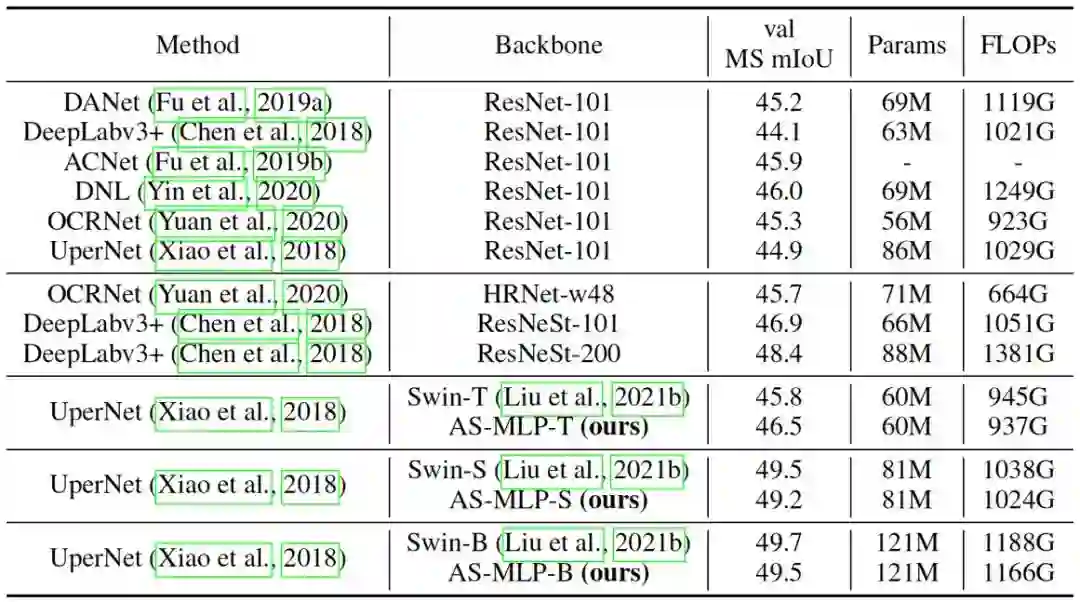 表三显示了我们的 AS-MLP 在 ADE20K 数据集上的性能。请注意,我们也是第一个将基于 MLP 框架应用于语义分割的工作。在更少的计算量的情况下,AS-MLP-T 取得了比 Swin-T 更好的结果(46.5 vs. 45.8 MS mIoU)。对于大型模型,UperNet + Swin-B 有着 49.7 MS mIoU,121M 参数和 1188 GFLOPs,UperNet + AS-MLP-B 有 49.5 MS mIoU,121M 参数和 1166 GFLOPs,这也显示了我们 的AS-MLP在处理下游任务时的有效性。图六也显示了我们的方法在ADE20K数据集上的语义分割的结果。