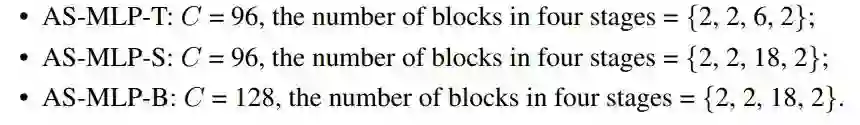 图四显示了AS-MLP框架的各种变种。不同的框架配置具有不同的参数量和计算量,用于与其他方法进行公平的结果比较。