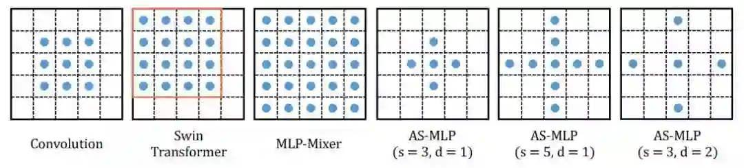 我们也对不同操作的感受野进行了分析,图三显示了神经网络中不同操作的感受野。在AS-MLP中,我们能使用不同的shift size和dilation rate,因此使得网络具有不同的感受野。例如,图四中的第六张图显示了当shift size为3,dilation rate为2时候的感受野大小。