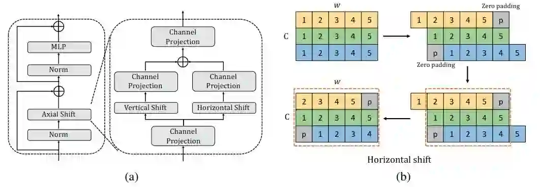 为了在基于 MLP 的架构中引入局部性,一个最简单、最直观的想法是在 MLP-Mixer 中添加一个窗口,然后对窗口内的特征进行局部信息的 token-mixing 投影,就像在 Swin Transformer 中所做的一样。然而,对于基于 MLP 的架构,如果我们划分窗口 (例如,7 x 7) 并在窗口中执行 token-mixing 投影,如果共享线性层,那么将只有 49 x 49 的参数,这极大地限制了模型容量,从而影响参数的学习和最终结果。如果不共享线性层,由于固定的 MLP 维度,模型将无法应用于下游任务。因此,我们为基于 MLP 的架构提出了一种轴向位移策略,我们在水平和垂直方向上空间移动特征。轴向位移可以将不同空间位置的特征排列在相同的位置。之后,使用 MLP 来组合这些功能,简单而有效。 这种方法使模型能够获得更多的局部依赖,从而提高性能。它还使我们能够像卷积核一样设计 MLP 结构,例如设计核大小和膨胀率。