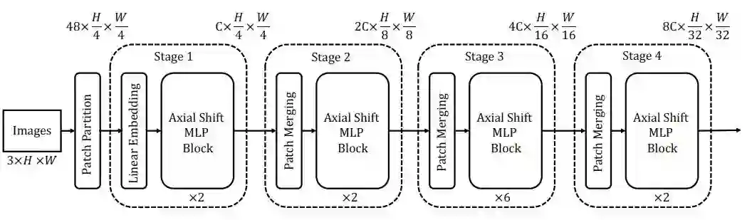 总体的网络结构如图一所示,AS-MLP一共有四个stage,对于图像分类任务,输入分辨率为224,在经过不同的stage时分辨率逐渐降低,最终的输出将使用交叉熵损失做图像分类。
