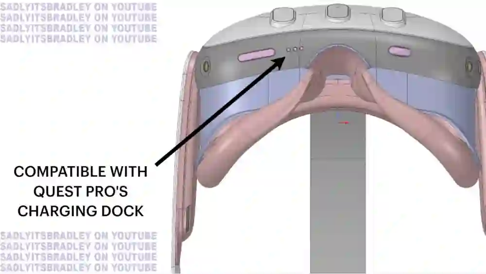 Quest 3右下边底座有3个金属触点,同样此前爆料的Quest Pro设计图中也有类似的设计。