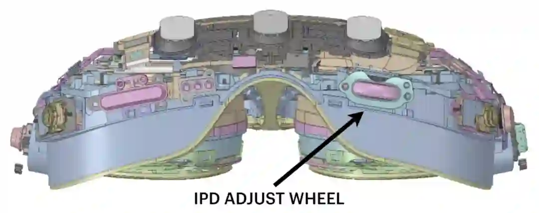头显下端IPD调节旋钮在左侧,还有音量滑块在右侧。