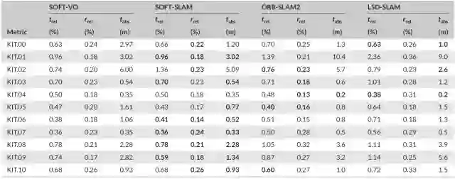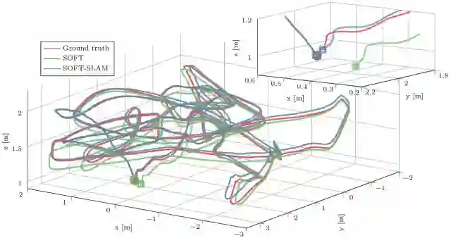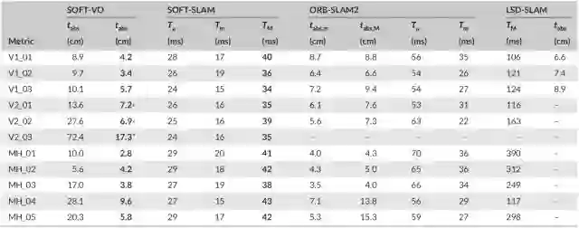 同时,SOFT-SLAM系统可以在困难场景下仅使用一个两线程的板载计算机获得确定性的结果,并且能够实现20Hz的恒定执行速率。更值得一提的是,无人机使用SOFT-SLAM在EuRoC的挑战3,阶段IIa-基准测试,任务2数据集中获得了最高定位精度。此外,作者还在两个主流数据集上对SOFT-SLAM系统进行了详细评价,并与其他主流的系统(如ORB-SLAM2, LSD-SLAM)进行了对比,结果显示SOFT-SLAM在大多数数据集上能够获得更高的精度,并且具有更高的运行效率。