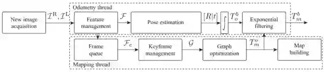 无人机在无GPS环境下的自主导航是一个具有挑战性的问题,尤其对于有效载荷小且电池使用时间有限的小型无人机来说更是如此。基于视觉的SLAM可能成为上述问题的一个解决方案,这是因为相机具有尺寸小,重量轻,可用性好以及信息带宽大等优点,很好规避了无人机的所有约束。在本文中,作者提出了一个能够输出高精度定位结果以及稠密环境地图的立体视觉SLAM系统。