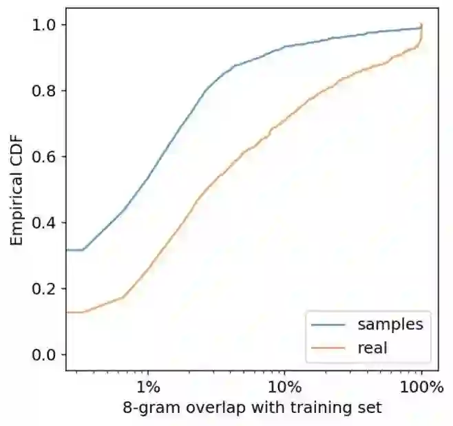 有人猜测模型会不会只是简单地记住了文本模版,然后再正确地把它们重复出来就可以了。这一点在他们的论文中也进行了讨论,作者们展示了 GPT-2 生成的样本和训练数据集之间的单词重复率,这个重复率实际上比测试集和训练集之间的单词重复率还要低。换句话说,GTP-2 表现出的记忆行为比随便取一段人类撰写的文字还要低。如果我们要说这个模型具有非平凡的泛化能力的话,这算是一条挺强力的证据了。