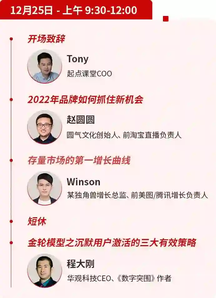 作为今年最后一场大会,我们聚焦在行业内的新机会、新商业、新增长,一起来复盘 2021 年的热点事件、产品、案例,分享一些有价值、可复用、可迁移的经验方法,聊聊 2022 年互联网人有哪些新的机会!