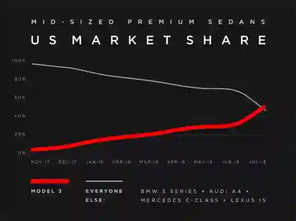 特斯拉Q2季度财报显示,因解决了部分产能瓶颈,第三季度Model 3产量会超过5万辆。特斯拉还列出了一个销售表,其提到Model 3不仅实现了产能爬坡,而且已经是美国中型豪华轿车市场7月份的销量冠军。