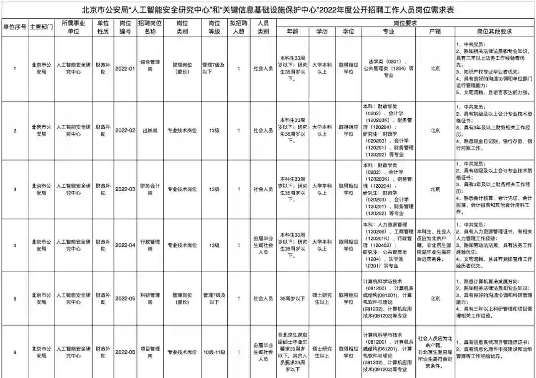 ,附件 1 即为《北京市公安局 “人工智能安全研究中心” 和“关键信息基础设施保护中心”2022 年公开招聘工作人员岗位表》。