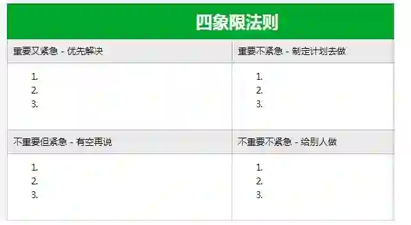 更进一步,深入到文件和工作内容上便是任务管理。任务管理的方式因人而异,既可以借助各类软件,也可以简单的写便签贴满工位,不必拘泥于方法种类。例如我自己并没有研究各种工具,而是简单得建立一个 Excel 的待办表单,每天早晚打开进行识别任务和更新进度。但重要是要清晰地辨别自己的工作内容哪些是重要的,哪些是紧急的,哪些是战略思考性的,哪些是边边角角不急于一时的。这里总体规划策略上我推荐使用史蒂芬·柯维(Stephen Covey)在《高效人士的七个习惯》里给出的四个分类: