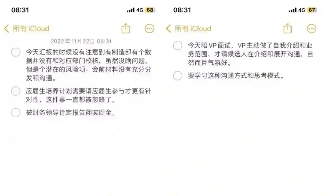 之后我便逐渐建立了自我复盘之旅:每天在下班路上思考当日工作要事自己的行为是否有出色或不妥之处,如果涉及如何改进就会形成工作笔记定期复看。每周设定特定半小时复盘当周工作关键进度和工作笔记,逐步形成了良性思考和闭环改进路径。我自己的常用三个问题如下作为参考:今天的工作有没有值得延深思考的事项?其他人哪个行为让你觉得值得思考或避免?自己做了哪些不错的动作值得坚持?