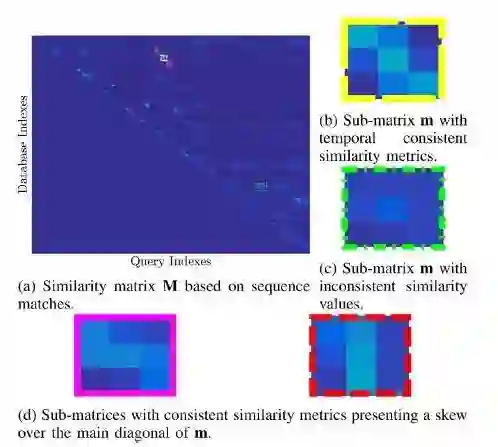 图6. 长度不等的序列之间的匹配。不同的序列用不同的颜色表示。当Sq查询到数据库时,公式(13)中最长序列的归一化项只在观察到相同和最短地图点的K个关键帧(品红区域)中计算。