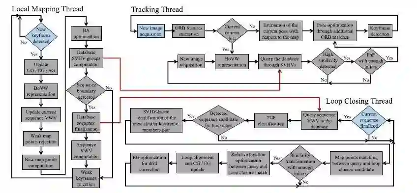 为了提供一个有效的解决方案,我们将系统调整到ORB-SLAM体系结构中,并且只替换了生成VWVs和查询数据库的机制。因此,不需要额外的计算步骤,因为可以将局部特征、VWs和映射点视为预先计算的。我们的方法是在vwds的基本描述单元的基础上逐步构建的,并生成不同的工具来将结构信息合并到图像的匹配功能中,以及描述整个场景的特征。