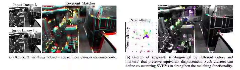 如图2,通过简单地从一张图像中聚类相邻的关键点,并不能保持相同的属性,因为当将不同深度的对象投影到相同的相机帧中时,仍然可以观察到距离较近的对象。与其他基于视觉短语的检索技术相比,计算出的组具有更好的旋转和尺度不变性。可以将这样一个关键点集群的BoVW表示为一个高阶VW,或结构感知的视图不变的高阶视觉单词(SVHVs),它利用环境的结构来识别一个重新游览过的地方。