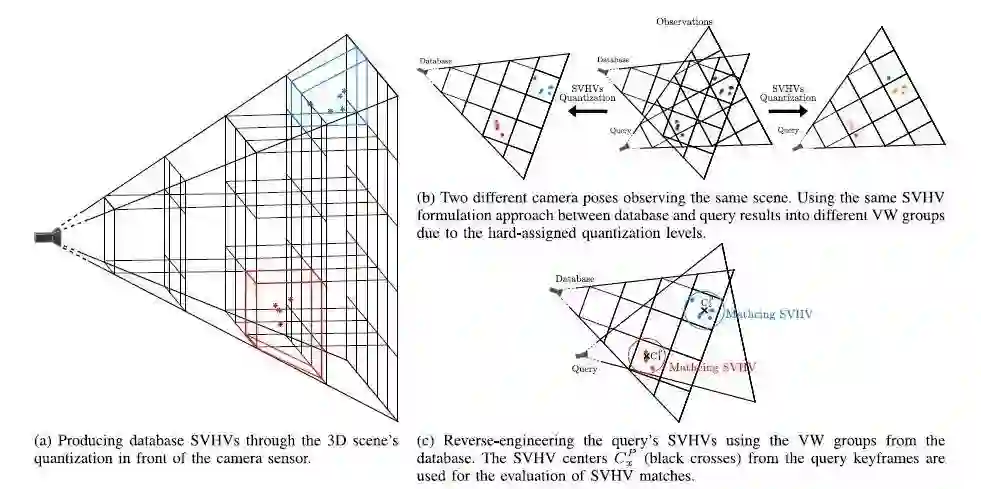 在这项工作中,我们对ORB-SLAM计算每个地图点的三维位置的过程进行拓展,形成数据库SVHVs。每当局部映射线程处理一个新的关键帧K时,使用固定的量化级别/步长对摄像机前的三维世界进行量化,以减少计算量,从而对可观察到的映射点进行聚类(图3(a))。在N0个计算的SVHVs中,每个都包含一个它们VW成员(wi,i∈[1,Nv])的多重集,表示为Gj={wi1,wi2,wi3,....},j∈[1,N0]。然后将出现的Gj分给关键帧K作为Bk=<G1,G2,...GN0>。