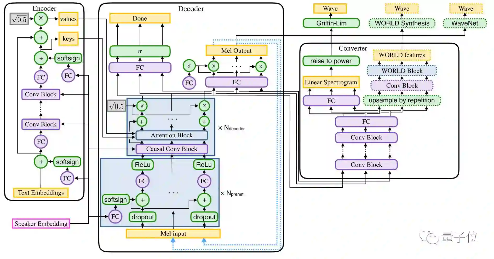 与前两代相比,Deep Voice 3采用了基于注意力的序列到序列模型,这个模型的详细架构如下图所示。