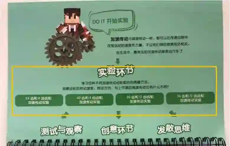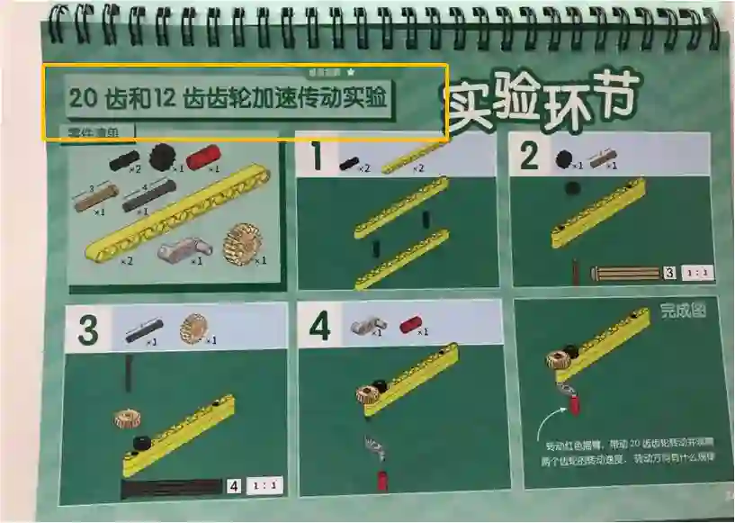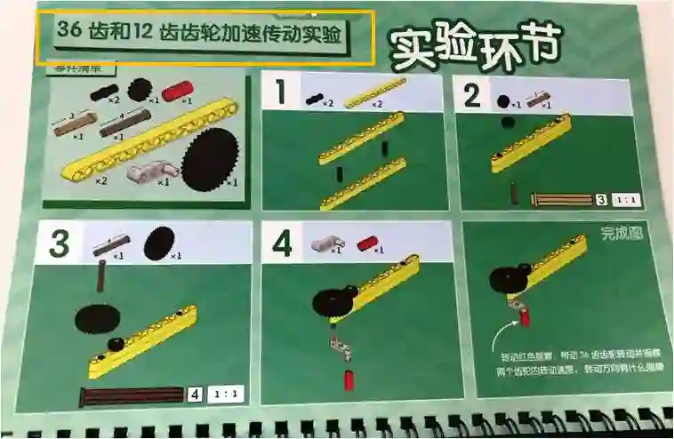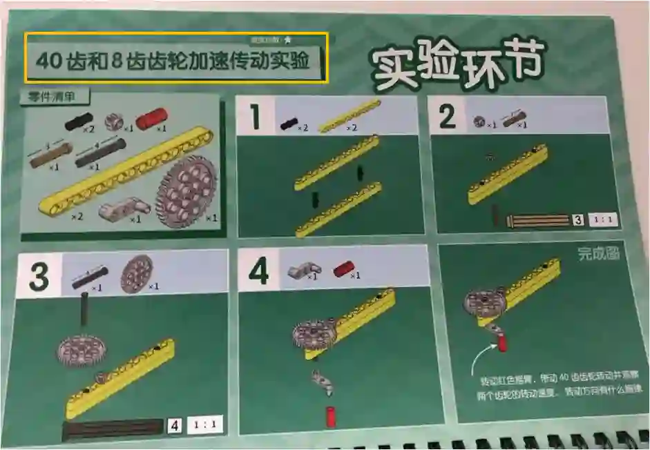比如在讲用齿轮做加速传动的部分,手册会指导孩子先搭建和做实验: