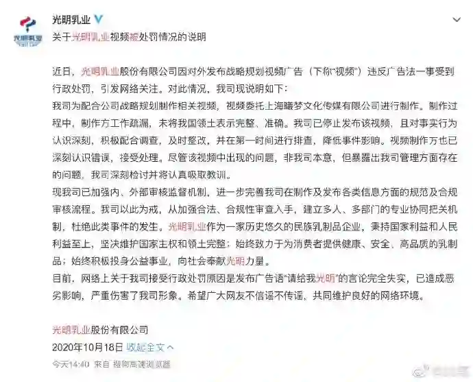 10月18日,上海市场监管局发布关于光明乳业广告被处罚情况的通报。通报指出,光明乳业通过官方网站对外发布的公司战略规划视频广告中含有未将我国领土表示完整、准确的地图,因违反广告法案依法作出罚款人民币叁拾万元整的行政处罚。
