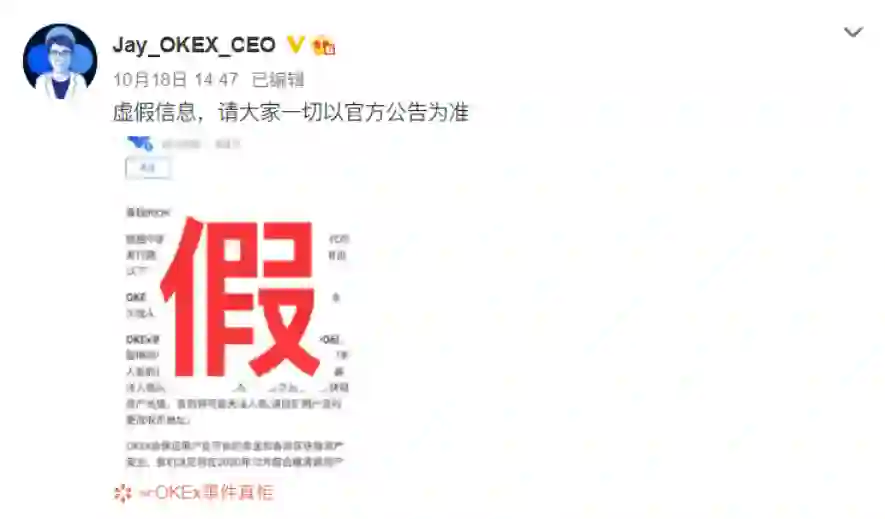 OKEX CEO辟谣:OKEX永久暂停服务为假消息