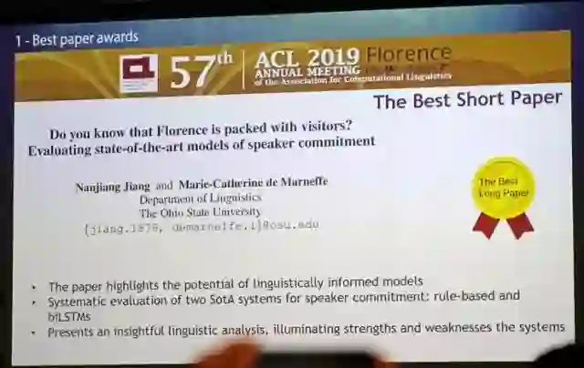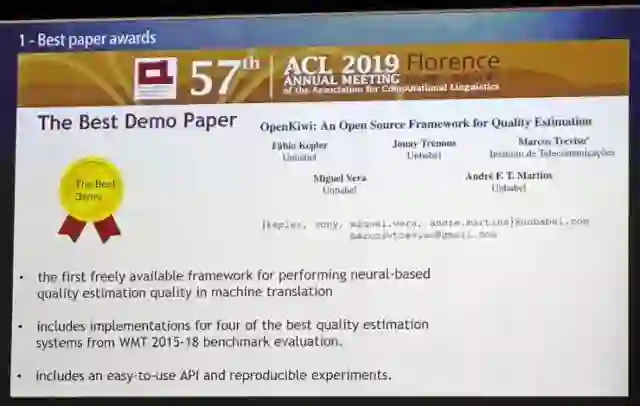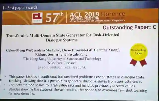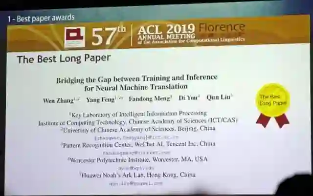 其中最佳长论文奖由张文(计算所)、冯洋(计算所)、孟凡东(腾讯)、Di You(Worcester)和刘群(华为诺亚方舟)获得。最佳短论文由俄亥俄州立大学的Nanjiang Jiang获得。