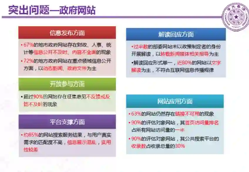 团队从全国3万多个政府网站中抽取了认为做的较好约400到500个网站,从信息发布、解读回应、开放参与、平台支撑、网站应用五个纬度进行绩效评估,发现了亮点,也找到了存在的问题。