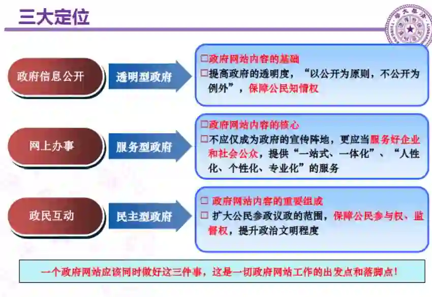 10年前国务院办公厅对网站已经有比较明确的定位。第一是“政府信息公开”;第二是“网上办事”,即服务导向,希望有越来越多的事情能够通过政府网站办理,减少线下的压力;第三是“政民互动”,网站是双向的,政府网站既是信息公开发布的平台,同时也是获取百姓诉求心声的平台。
