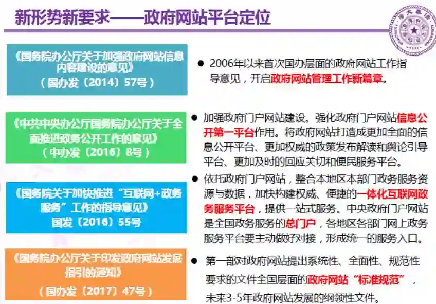 为此国务院办公厅从2014年至今颁布一系列政策对政府网站建设和维护进行规范和指导。