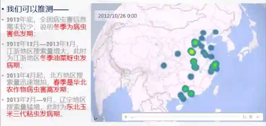 在全国访问农业部网站的统计结果中抽取访问病虫害相关的数据,按照地理纬度打点,标记出来画成热力图并把一年热力图串成一帧帧动画播放看整个效果,推测这张图可能和全国实际发生的病虫害情况一致。甚至还可以推测出一些结论,比如2012年底冬季病虫害信息比较少,冬季是病虫害的低发期,12月到1月江浙地区的关注量非常大,可能是冬季油彩蚜虫的发病期。
