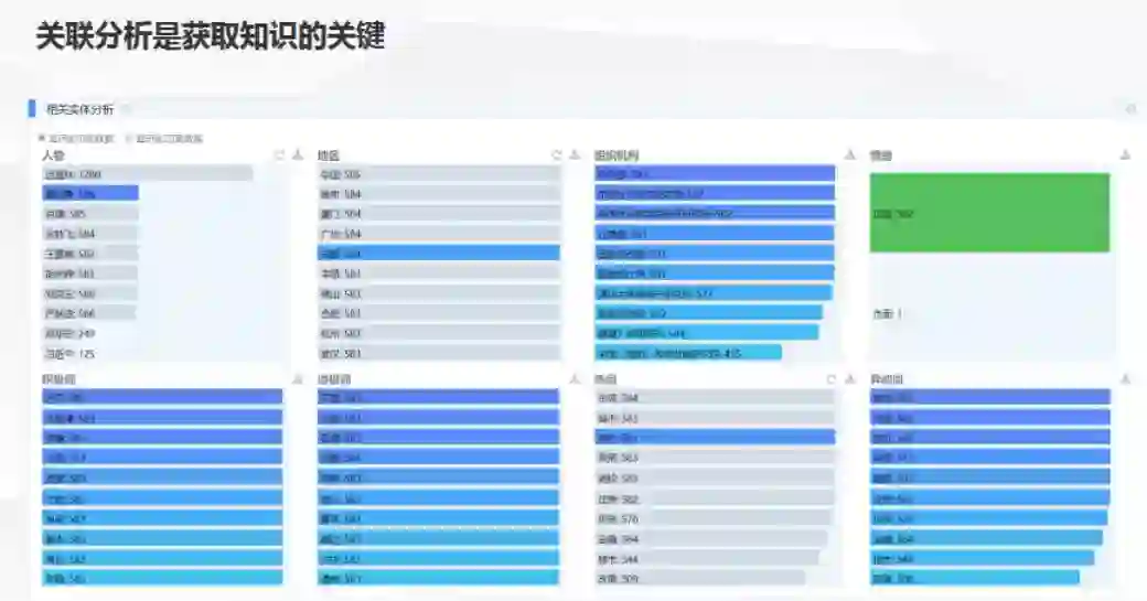 国双实现了横跨8个纬度的知识关联实体的统计分析。这样的关联分析不仅是给一个信息或数据的呈现,而是能够更好更直接的回答问题,甚至去挖掘一些你可能都不知道的问题。
