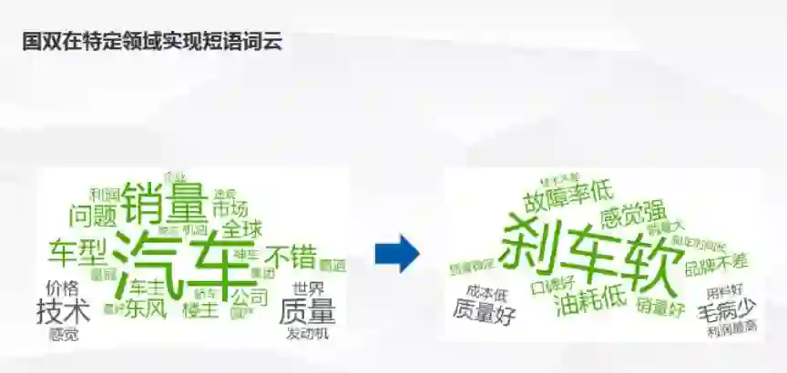 从关键词词云到短语词云,能够帮助我们更好的从文本信息里挖掘知识,这是一种初步的数据智能。右边的图是国双在特定行业领域实现的结果。分析文本得到的结果不是说用户在讨论刹车、用户在关注油耗,而是直接告诉你这些用户认为你的刹车疲软,认为你的汽车油耗低,更直观的把结论和知识呈现出来。