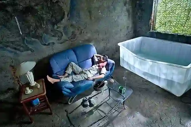 《家在兰若寺》讲的是一个奇幻故事,一个词概括就是人鱼之恋,全片没有一句台词。蔡明亮的风格在这部电影里得到了延续:标准的长镜头,用空间拉长观众心理时间的方法,甚至包括“水”的意象。