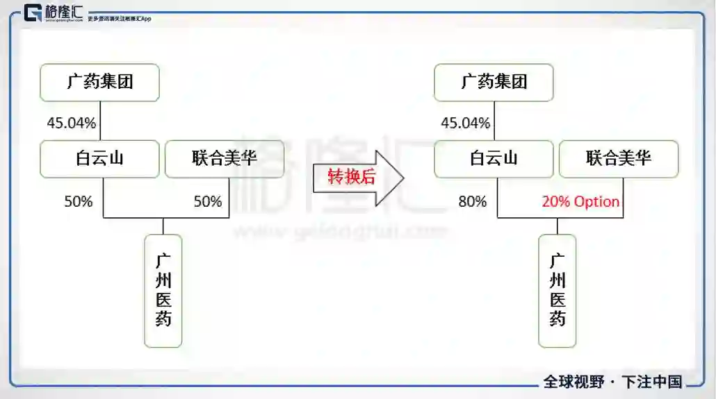 至此白云山对广药的股份从50%增持到80%。剩余的20%股权,白云山以Option的形式售于联合美华,联合美华可以在行权期内(交割完成后的六个月至三十六个月)售出。