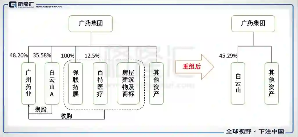2013年3月,白云山A退市,同年5月完成重组,此时广州药业成为广药集团下属唯一的医药主业上市公司,股票简称改为“白云山”。经过此次重组,广药集团对“白云山”的持股比例由48.20%降至45.29%。