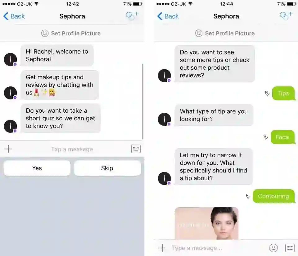 著名的化妆品连锁店丝芙兰,就在通信应用 Kik 里,提供能和消费者一对一对话的聊天机器人。这个机器人和你聊天的时候,会先咨询你的个人情况,比如皮肤状态、头发颜色等,然后根据聊天内容,提供针对用户个体的美妆和护肤建议。聊天过程中它还会使用表情包,让对话看起来更像是真人进行的。