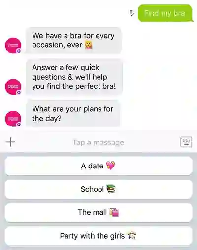 举个例子,维多利亚的秘密这个内衣品牌,大家都知道,它家每年的内衣走秀,是全世界年轻人都关注的盛会。它的副牌 PINK,就使用聊天机器人,通过对话的方式,让用户完成一个调查问卷,根据问卷的答案,再去给用户推荐适合他们的内衣。