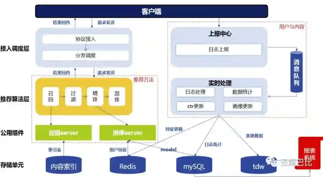 存储单元:不同的数据类型和用途会储存在不同的存储单元中,例如内容标签与内容的索引存储在 mysql 里,实时性数据存储在 redis 里,需要进行数据统计的数据存储在 TDW 里。
