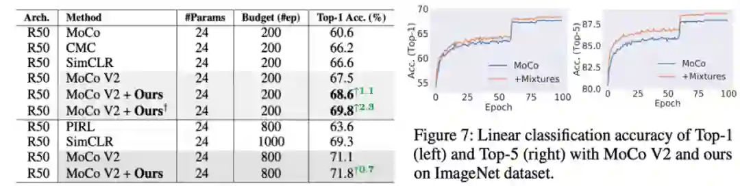 ,文章提出的方法在 200 和 800 epoch 两种不同的的训练参数设置下都有比较稳定的提升: