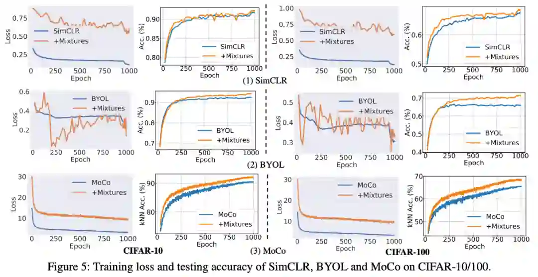 可以发现一个比较有趣的现象:在加入了 Un-Mix 之后,训练的损失值(training loss)变得非常不稳定,波动很大,这是因为在输入空间进行图像融合操作之后导致两个分支的距离度量变得更加细微多样和敏感。但是这对模型泛化能力是有帮助的,在做模型测试的时候依然可以取得更好的测试性能。
