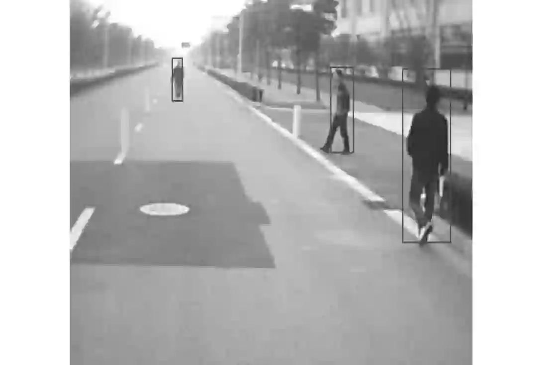 图 6 所示为模拟交叉路口环境下采集的某一视频帧。由图可见,通过以上方法可以有效提取不同距离下的行人兴趣区域。