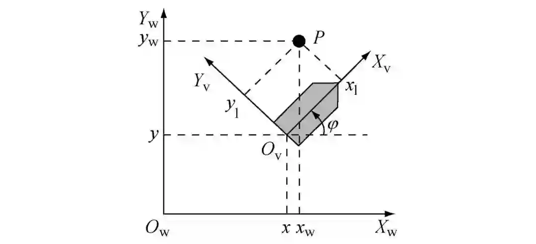 在图 3 中,P 点代表行人,(x_l,y_l) 代表某车辆坐标下的行人局部坐标,(x_w,y_w) 代表行人的世界坐标,(x,y)为车辆位姿。在某一触发信号下,由于激光雷达和摄像头采集数据帧时刻不同,车辆位姿在这 2 个时刻之间发生了偏移,以图像时刻为基准点,由平面坐标变换可推导得: