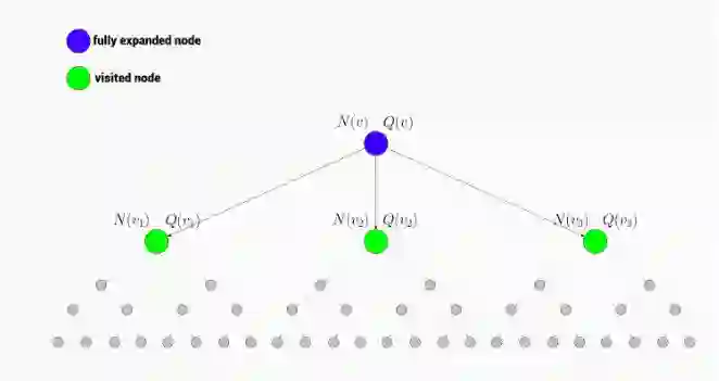 在搜索的一开始,由于我们还没有开始任何模拟,所以首先选择未访问的节点。单个模拟从根节点开始遍历到叶节点,结果又反向传播到根节点,然后根节点被认为完全展开。